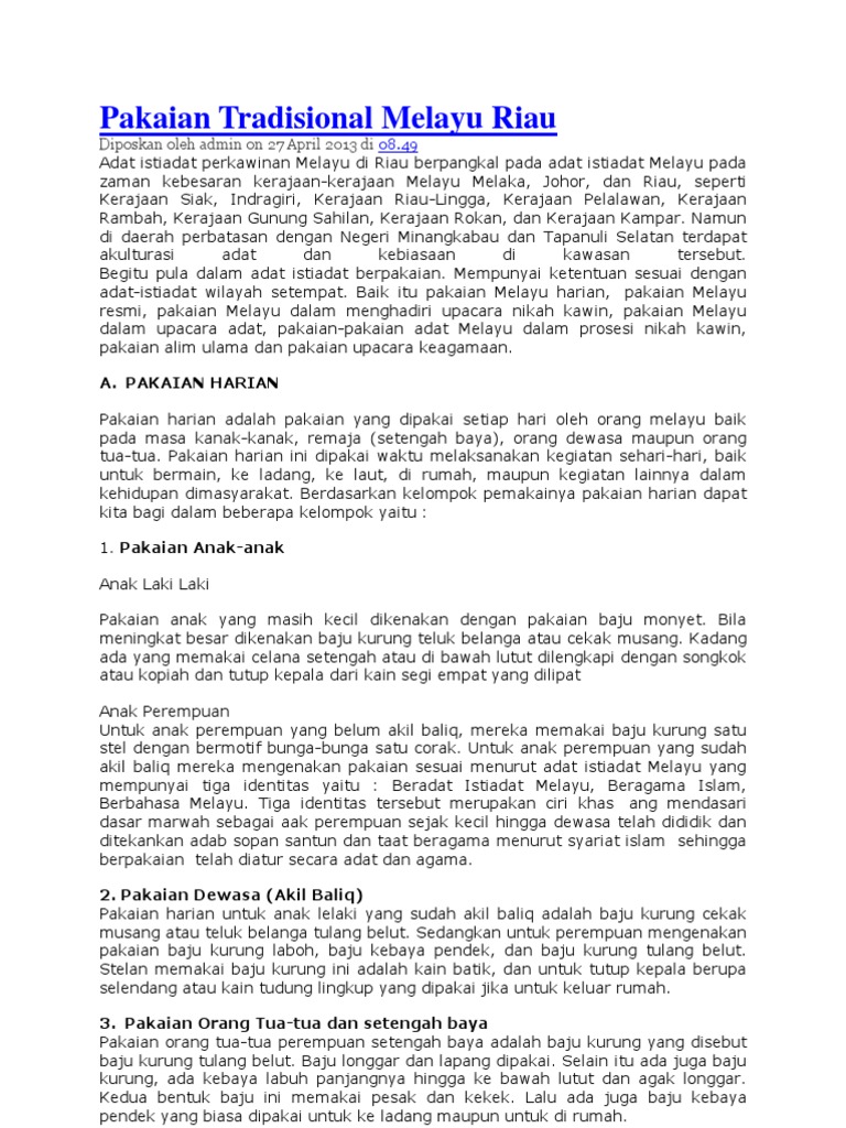 Pakaian Tradisional Melayu Riau Yaitu Kecuali