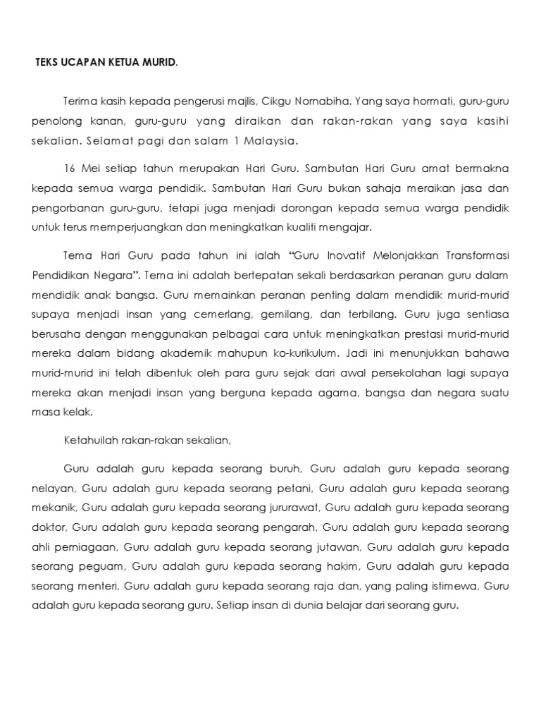 Teks Ucapan Ketua Murid Sempena Hari Guru Skbg 2015 2