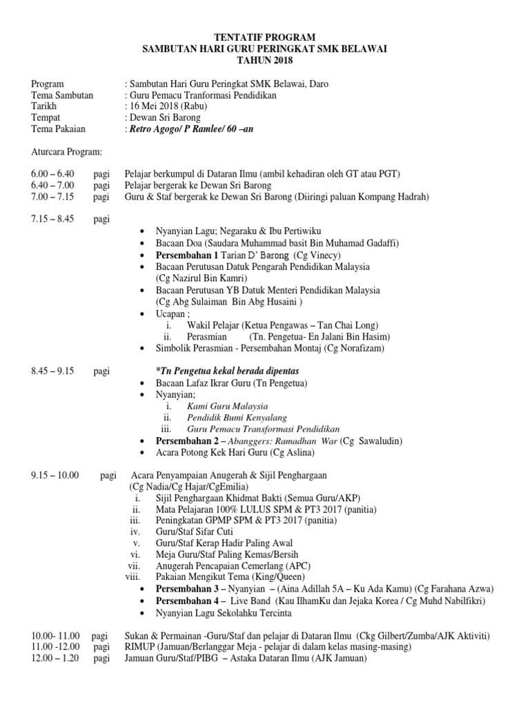 Tentatif Program Sambutan Hari Guru Peringkat Smk Belawai