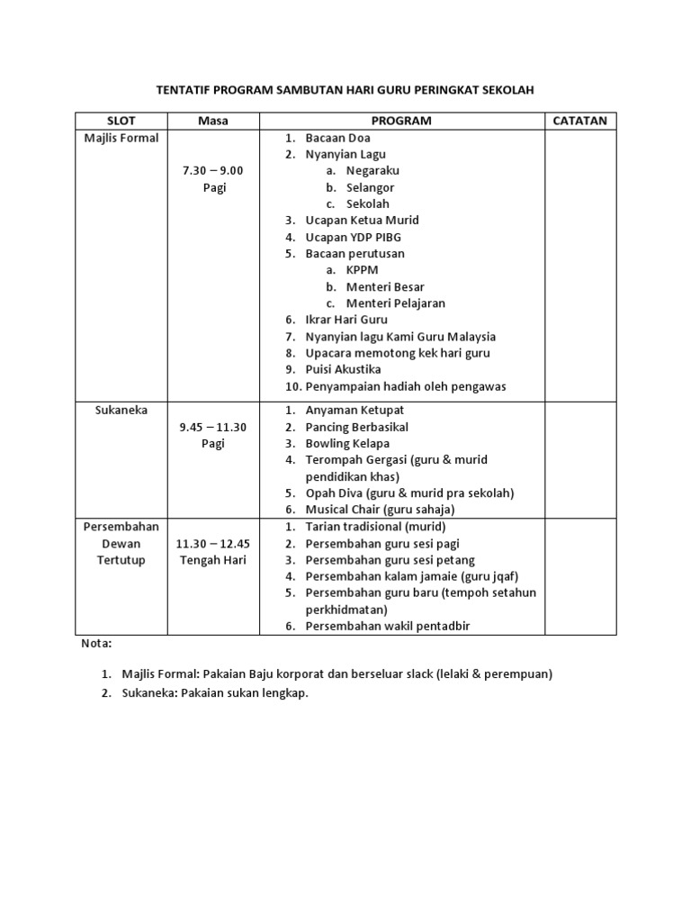 Cadangan Tentatif Program Sambutan Hari Guru Peringkat Sekolah